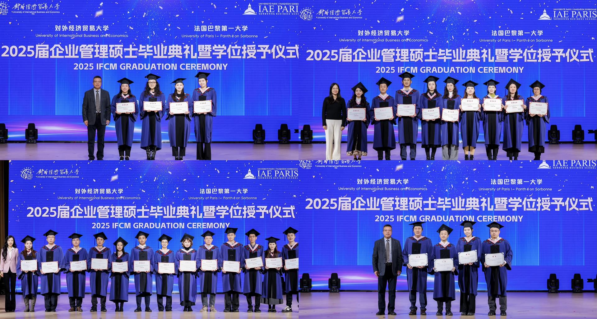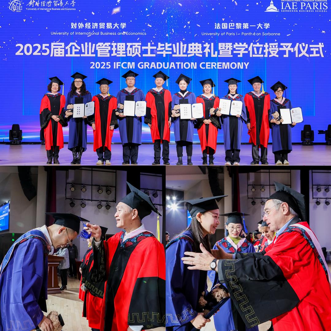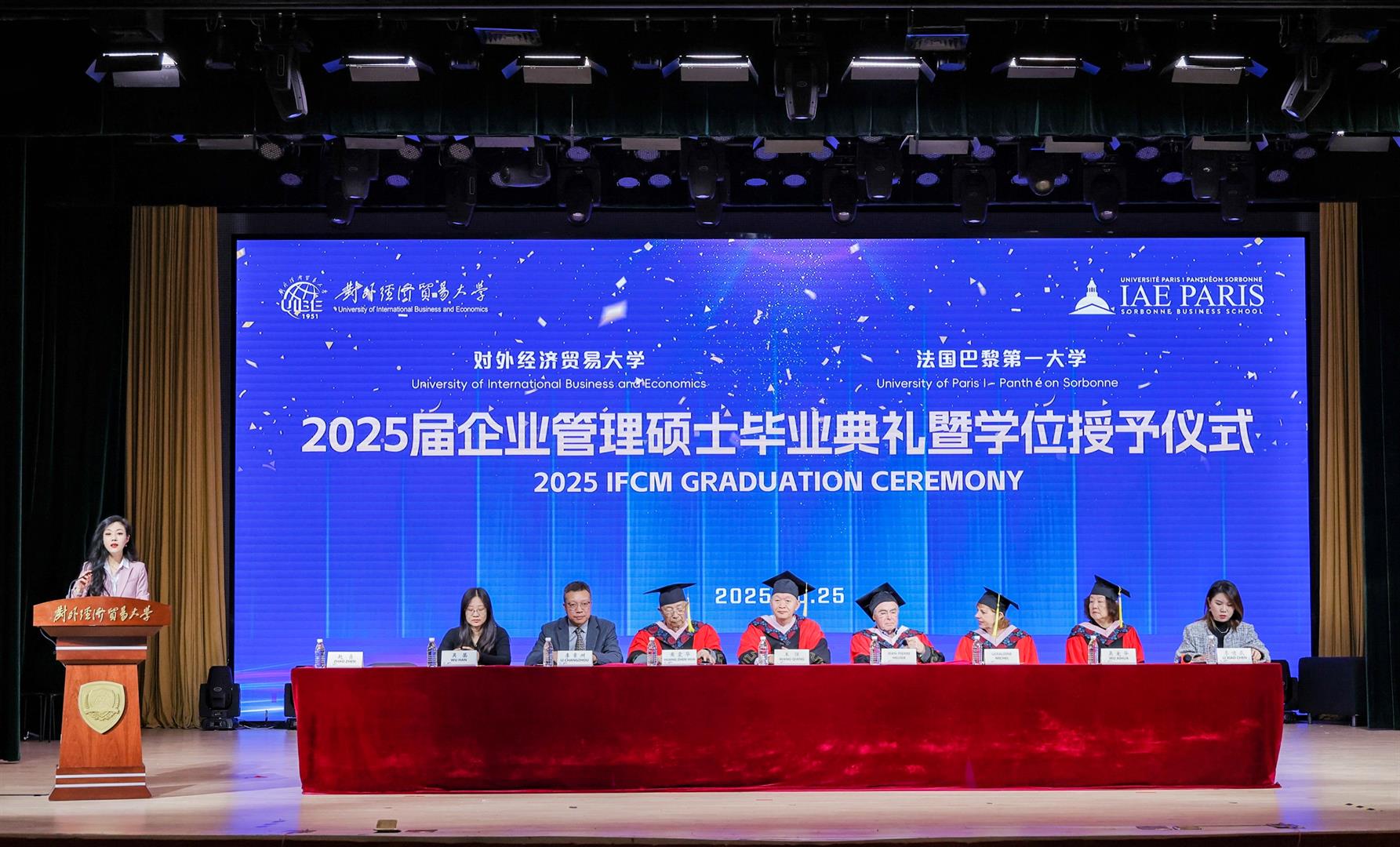 (巴黎一大项目部/稿)2025年10月25日,我校与法国巴黎第一大学合作举办的企业管理硕士项目2025届毕业典礼隆重举行。对外经济贸易大学副校长王强、高级研修学院院长李常州、国际合作交流处副处长吴菡、高级研修学院副书记赵贞、法国巴黎第一大学企业管理学院荣休教授、名誉主任Jean-Pierre Helfer、巴黎一大企业管理硕士项目法方主任Géraldine Michel,以及中方教师代表黄震华教授、吴爱华教授出席,典礼由赵贞主持。