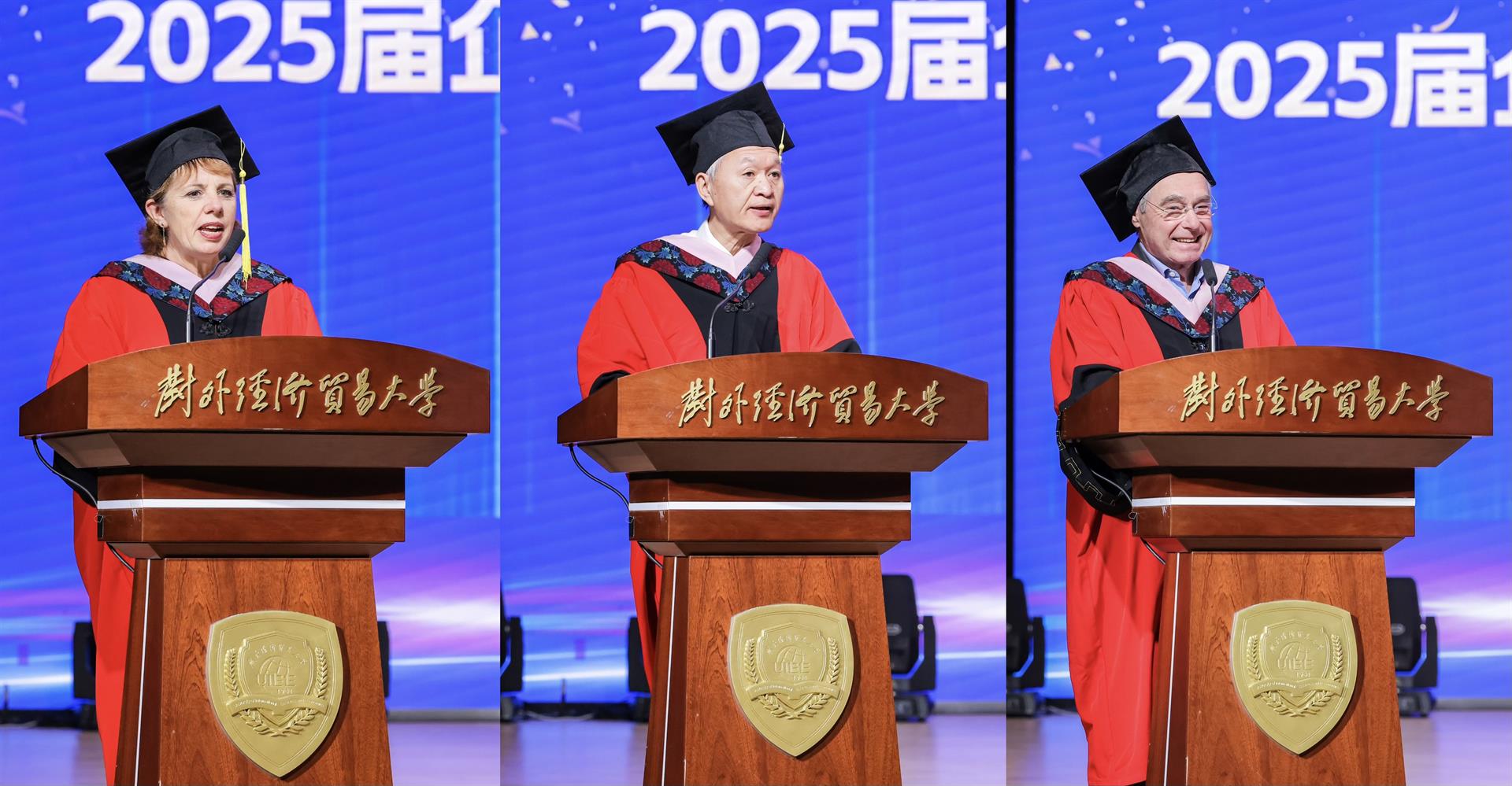 毕业生代表司蕾、宋冠男在发言中回顾了从课堂学习、巴黎研修到论文写作的求学历程,感谢中外母校的悉心培养和师生的深厚情谊,并表示将带着这段经历赋予的专业能力与坚定信心,在未来的职业发展和深造道路上勇敢前行。